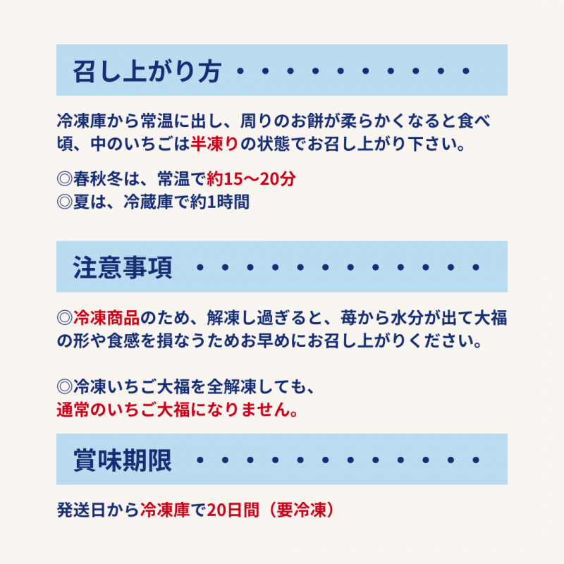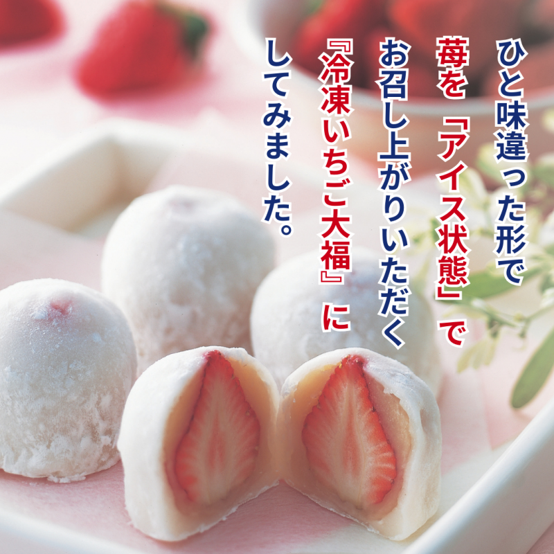 ※冷凍商品のため解凍をし過ぎますと、苺から水分が出てきて大福の形が崩れ たり、食感や品質を損ないますのでお早めにお召し上がり下さい。